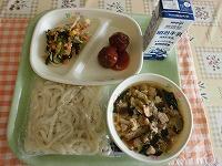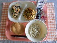 今日の献立は、「きつねうどん りっちゃんの元気サラダ 野菜肉団子 牛乳」でした。