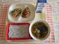 今日の献立は、「ごはん 鶏肉のレモンソースかけ かんぴょうのごまあえ キムチスープ 牛乳」でした。