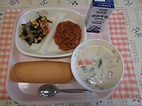 今日の献立は、「スラッピージョー 海藻サラダ ニョッキのクリームスープ 牛乳」でした。