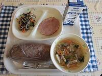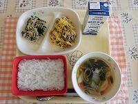 いつものビビンバとは少し変わった、しいたけやごぼう、しらたきが入った、和風のビビンバでした。今日の給食は、完食する児童がたくさんいました。野菜が苦手の児童も、もやしのナムルだと食べやすかったようです。