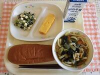 今日の献立は、「はちみつパン 厚焼き卵 ごまチーズサラダ カレーうどん 牛乳」でした。