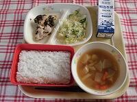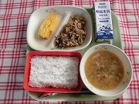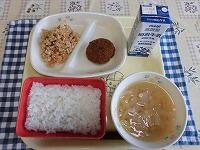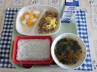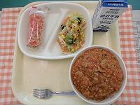 人気の三色丼でした。今回は、鶏そぼろの茶色、炒り卵の黄色、ほうれん草のごまあえの緑の三色でした。それぞれ、ごはんに三色丼の具を盛り付けて食べました。みなさんよく食べていて、完食する人がたくさんいました。