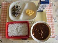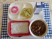 今日の献立は、「ごはん ビーフカレー 福神漬け フルーツヨーグルト 牛乳」でした。