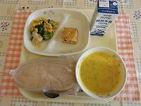今日の献立は、「きなこ揚げパン 花野菜サラダ ほくほくかぼちゃのすうぷ 牛乳」でした。