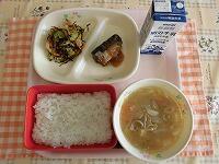 今日の献立は、「ごはん さばのスタミナ焼き もやしとのりのあえもの ピリ辛みそ汁 牛乳」でした。