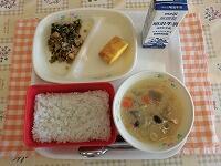 具だくさんのみそ汁に少しだけ豆板醤を入れてほんのりピリ辛なみそ汁が出ました。豚肉や里芋、人参、大根、こんにゃく、しいたけ、ねぎなどの材料にバターとみそを使い、コクのある味付けの汁ものになりました。具沢山なのでいろいろな栄養が摂取できます。今日もよく食べていました。
