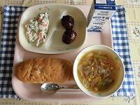 今日の献立は、「食パン チョコクリーム 野菜肉団子 ハムチーズサラダ ミネストローネ 牛乳」でした。