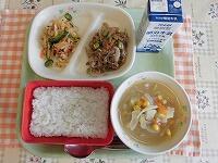 今日の献立は、「和風ビビンバ丼 ねぎと生姜のスープ 杏仁フルーツ 牛乳」でした。