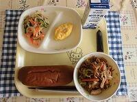 今日の献立は、「黒糖パン トマトミートオムレツ バンバンジーサラダ 焼きそば 牛乳」でした。