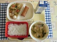 今日の献立は、「ごはん とちまるくん卵焼き 豚にらもやし炒め ゆばのすまし汁 牛乳」でした。