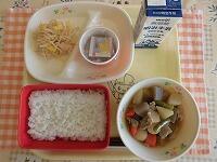 給食では、栃木県産の農産物をたくさんとりいれています。今日は、矢板市産こしひかりで作ったごはん、栃木県産豚肉・大豆・にら・ごぼう・かんぴょうで作った栃木飯の具、栃木県産の里芋・白菜・ねぎ・大根・みそで作った里芋のみそ汁、そして栃木県産の牛乳でした。