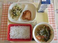 今日の献立は、「ごはん 鶏肉のにらソースかけ 即席漬け けんちん汁 牛乳」でした。
