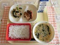 今日の献立は、「キムたくごはん 肉シューマイ わかめスープ 牛乳」でした。