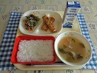 今日の献立は、「ごはん 鶏肉の香味焼き ゆかりあえ 豆乳仕立ての野菜汁 牛乳」でした。