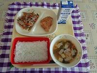 今日の献立は、「ごはん かつおカツ 野菜の中華あえ ビルマ汁 牛乳」でした。