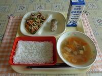 今日の献立は、「キムたくごはん 青大豆の肉団子スープ もも 牛乳」でした。