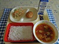 今日の献立は、「ごはん キーマカレー 福神漬け グリーンサラダ 牛乳」でした。