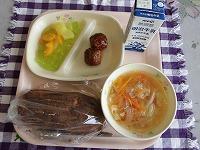 今日は、秋の味覚の食材や秋をイメージした色の食材を取り入れた、秋の香りがするシチューが出ました。かぼちゃがベースのシチューに、栗やしめじ・ベーコン・えびなどの食材を入れてじっくりと煮込みました。栗とかぼちゃの甘味を生かした、具だくさんがうれしいシチューです。牛乳がたっぷり入っていますので、丈夫な骨を作ってくれるカルシウムがたくさんとれます。