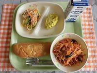 今日の献立は、「ミートソーススパゲティ イタリアンサラダ 米粉ドック 牛乳」でした。