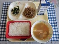今日の献立は、「ごはん 納豆 れんこんサラダ きりたんぽ汁 牛乳」でした。