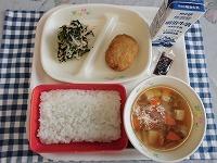 今日はみなさんに人気のカレーが出ました。豚肉を使って・玉ねぎ・人参・じゃがいもと一緒に炒めてじっくりと煮込みました。豚肉には、みなさんが成長するために必要なたんぱく質を豊富に含んでいます。また、スタミナ効果があるビタミンB1が多く含まれています。給食のカレーは、たくさんの量を作るので、家庭とは違ったおいしさがあります。今日も、みなさんおいしそうに食べていました。