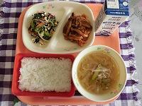 豚肉には、ビタミンB1がたくさん含まれています。疲れをとる効果がありスタミナがつきます。今日は、栃木県産のもやし・にらなどの野菜と一緒に炒め、韓国の漬物「キムチ」と一緒に炒めました。韓国の給食では、毎日のようにキムチが出るそうです。今日は、みなさんが食べやすいように辛さを控えて作りました。
