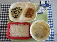 今週は、大豆ウイークとして、大豆をいろいろな姿に変身させて献立の中にとり入れています。今日は、大豆を変身させた納豆をとり入れています。納豆は、ゆでた大豆に納豆菌をつけてあたためて作ります。大豆には質のよいたんぱく質や脂肪、ビタミン、無機質がバランスよく含まれている、栄養満点の食品です。血液をサラサラにしてくれたり、腸の働きをがよくなり、肌もつやつやして美肌効果や、体調がよくなるなど、納豆を食べると体にいいことがたくさんあります。