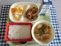 今日の献立は、「ごはん 豚キムチ炒め わかめスープ フルーツ杏仁 牛乳」でした。