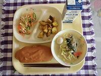 今日の献立は、「アップルパン 春巻 バンバンジーサラダ ちゃんぽん麺 牛乳」でした。