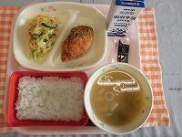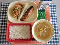 今日の献立は、「ごはん 鮭の塩焼き 青菜の漬物 すいとん汁 牛乳」でした。
