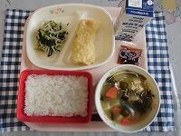 今日の献立は、「いか天丼 ごまじゃこサラダ じゃがいものみそ汁 牛乳」でした。