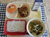 今日の献立は、「キムたくごはん 春雨の中華スープ フルーツ杏仁豆腐 牛乳」でした。