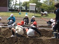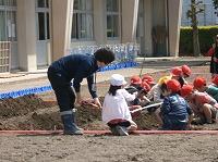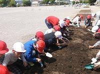 6年生の緑化委員会の児童が 雑草の袋を集めたり、まいた肥料を土地と混ぜたりして