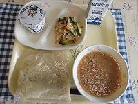 今日の献立は、「ごはん 鶏肉のごまみそ焼き 春雨とハムのサラダ ビルマ汁 牛乳」でした。