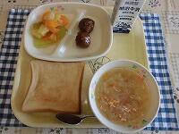 今日の献立は、「ココアトースト 肉団子 ミネストローネ フルーツのゼリーあえ 牛乳」でした。