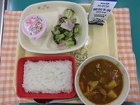 今日の献立は、「ごはん チキンカレー ハムのグリーンサラダ お祝いデザート 牛乳」でした。