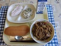 今日の献立は、「コッペパン ミートソーススパゲティ 花野菜とコーンのサラダ ヨーグルト 牛乳」でした。