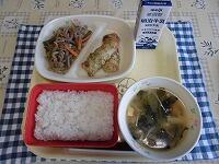 今日の献立は、「ごはん さばのカレー風味焼き 磯辺あえ みそけんちん汁 牛乳」でした。