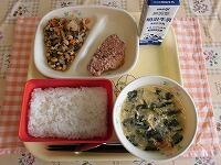 今日の献立は、「ごはん 豚にらもやし炒め ほうれん草のツナあえ なめこと豆腐のみそ汁 牛乳」でした。