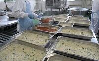 かた焼きそばは、中華麺を油で揚げたり焼いたりしてパリパリの麺にします。その上に野菜や肉を炒めて作った中華あんをのせてからめて食べます。パリパリの麺にあんの水分がしみ込むと麺はやわらかくなり、パリパリの食感とは違った食感を楽しむことができます。給食では、豚肉やいか、うずら卵の他に白菜、にんじん、もやしなど、9種類の材料を炒めて作った中華あんの中に、パリパリ麺を入れてからめながらいただきました。