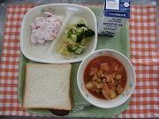 今日の献立は、「食パン チョコクリーム 肉だんご 野菜スープ フルーツゼリーあえ 牛乳」でした。