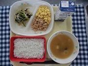 今日の献立は、「セルフ三色丼(鶏そぼろ 炒り卵 小松菜の胡麻あえ) きのこのみそ汁 牛乳」でした。