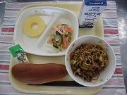 焼きそばは、中国語で「炒麺(チャオメン)」といいます。中国の焼きそばは、塩やしょうゆなどで味を付けます。ソースで味付けをする焼きそばは、日本で考え出されました。給食の焼きそばには、豚肉や人参・キャベツ・もやし・いかなどが入っています。野菜などのうま味が焼きそばをさらにおいしくしてくれます。