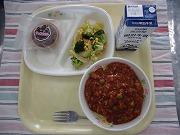 今日の献立は、「コッペパン スラッピージョー 花野菜とチーズのサラダ クラムチャウダー 牛乳」でした。