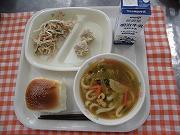 今日の献立は、「セルフビビンバ ギョーザスープ 牛乳」でした。