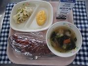 今日は、佐野市で人気のメニューを取り入れました。汁物は、ふんわりとした卵にプリプリ食感のえびと小松菜が入った中華風のスープです。佐野市では、佐野市特産のかき菜を使用しているそうです。メインのおかずは、鶏肉の唐揚げにレモンのさわやかな酸味があるたれをかけました。他には、コリコリとした切干し大根の食感が特徴のサラダが出ました。
