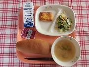 今日の献立は、「米粉パン 鶏肉のレモンソースかけ えびと卵のスープ 切干し大根ときゅうりのサラダ 牛乳」でした。