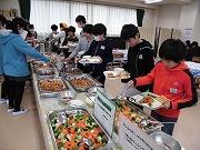 明日は卒業式のため、6年生にとって、小学校で食べる給食は今日が最後です。今日は、6年生の卒業お祝い献立でした。みなさんが大好きな鶏の唐揚げに、アーモンドが入ったみそダレをからめたものや、季節の野菜である菜の花を使ったあえもの、白いうずら卵とピンク色のはんぺんを入れたすまし汁、とちおとめのゼリーの組み合わせでした。