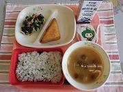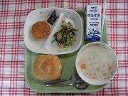 今日の献立は、「ごはん 豆腐ハンバーグ ひじきのあえもの 根菜のごま汁 牛乳」でした。