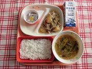 今日の献立は、「ごはん 春巻 中華風もやしあえ 豆腐チゲスープ ひじきぱっぱ 牛乳」でした。